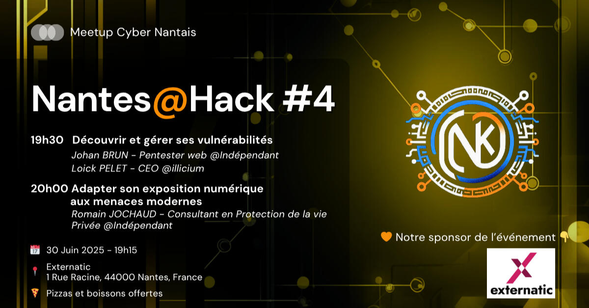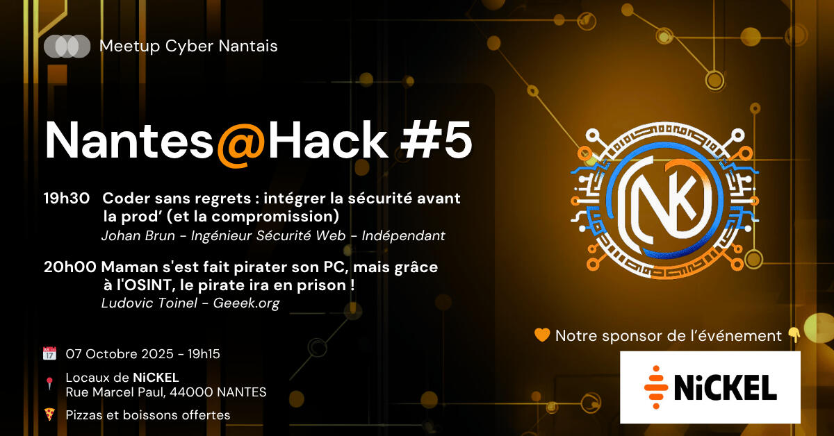 Basée à Nantes, la communauté Nantes@Hack a pour vocation de rassembler différents étudiants, amateurs ou professionnels de la Cybersécurité, afin de se rencontrer, d'échanger et créer des liens.Principalement basé sur l'organisation de "talks" publics, nous proposons également des interventions en école afin d'initier les futurs professionnels à différents sujets de Cybersécurité